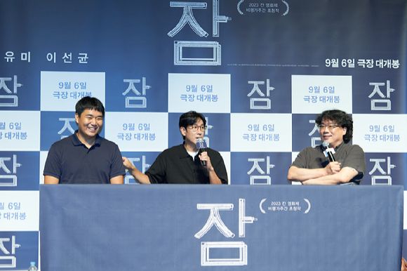 지난 26일 서울 롯데시네마 월드타워에서는 '잠'의 유재선 감독, 배우 이선균 그리고 봉준호 감독이 참석한 '잠'의 스페셜 GV(관객과의 대화)가 진행됐다. 이번 스페셜 GV는 서울, 부산, 대전, 대구, 김포의 전국 5대 도시에서 진행된 최초 시사회인 동시에 상영 종료 후 GV가 라이브로 동시 중계됐다.