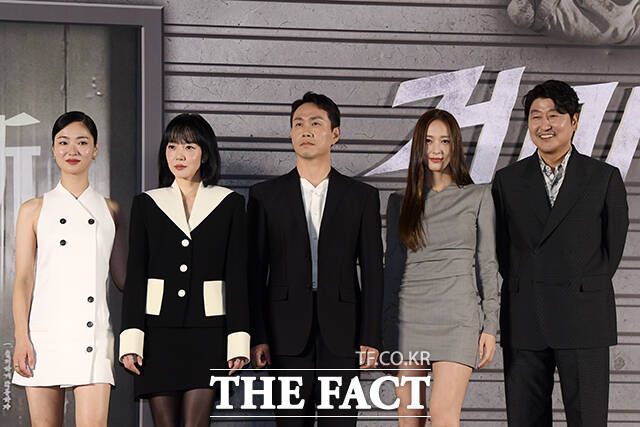 [더팩트ㅣ서예원 인턴기자] 김지운 감독과 배우 전여빈, 임수정, 오정세, 정수정, 송강호(왼쪽부터)가 29일 오전 서울 용산구 CGV 용산 아이파크몰에서 열린 영화 '거미집' 제작보고회에 참석해 포즈를 취하고 있다.