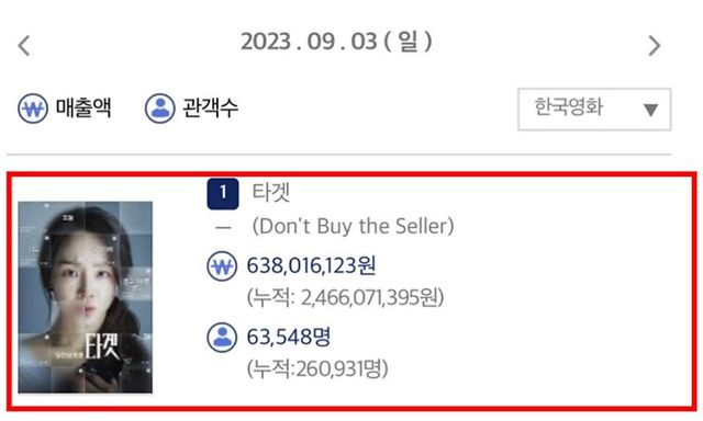 영화 <타겟> 은 중고거래로 범죄의 표적이 된 수현의 일상 속에서 벌어지는 서스펜스를 담은 스릴러. 오직 극장에서만 경험할 수 있는 상상 이상의 서스펜스를 선사하며 입소문 열풍을 불러일으키고 있는 영화 <타겟> 이 개봉 첫 주 누적 관객수 260,931명을 동원했다. 이는 개봉 이후 5일 연속 한국영화 박스오피스 1위를 유지하고 있는 것은 물론, <오펜하이머> 와 함께 9월 극장가 쌍끌이 흥행을 이끌고 있어 앞으로의 흥행세에 귀추가 주목된다. 특히 일상의 서스펜스를 극대화시키는 현실적인 소재와 스릴러의 만남, 극적 공감을 높인 신혜선, 김성균, 강태오, 이주영의 열연을 향한 남녀노소를 불문한 열띤 호평이 이어지고 있다. CGV 실관람객 평가 점수인 골든에그지수 91%(2023년 9월 3일(일) 기준)를 기록 중인 것. 오펜하이머> 타겟> 타겟>