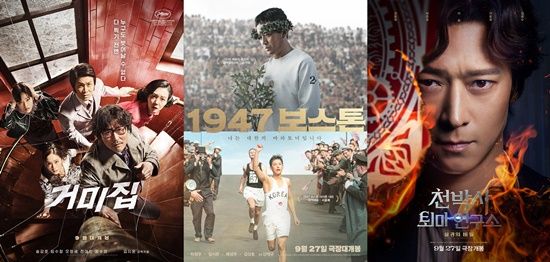 (엑스포츠뉴스 김유진 기자) 추석 연휴를 하루 앞둔 27일 영화 '거미집'(감독 김지운)과 '1947 보스톤'(감독 강제규), '천박사 퇴마 연구소: 설경의 비밀'(감독 김성식)까지 세 편의 작품이 나란히 개봉해 관객들을 만난다.
