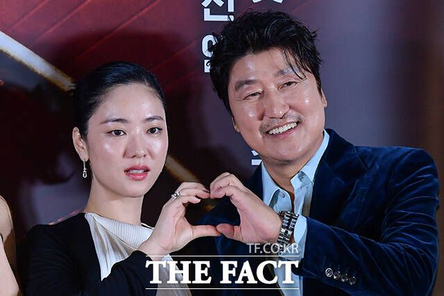 배우 전여빈과 송강호(오른쪽)이 14일 오후 서울 강남구 메가박스 코엑스에서 열린 영화 '거미집' 언론배급시사회 및 기자간담회에 참석해 포즈를 취하고 있다. /서예원 인턴기자