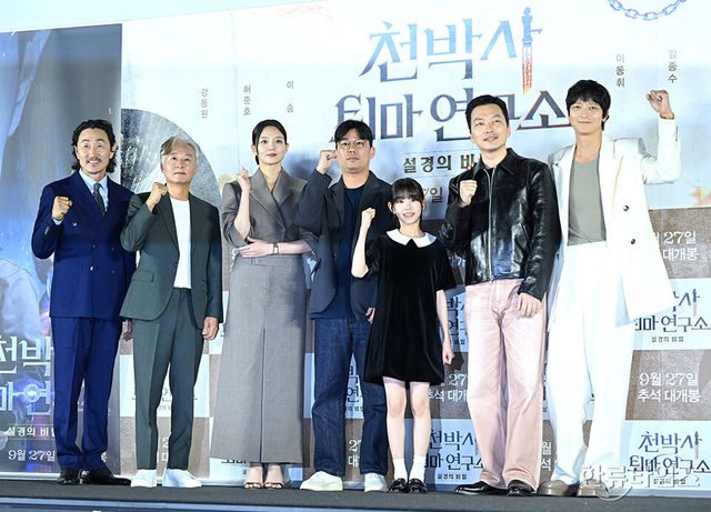 배우 강동원, 허준호, 이솜, 이동휘, 김종수, 박소이, 김성식 감독이 19일 오후 서울 용산구 CGV 용산아이파크몰에서 열린 영화 '천박사 퇴마 연구소: 설경의 비밀' 언론시사회에 참석해 포토타임을 갖고 있다.