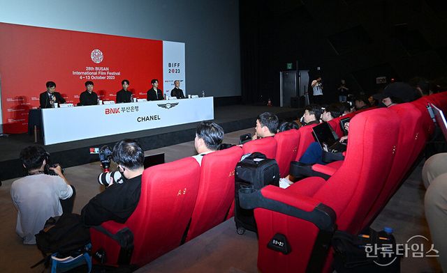 남동철, 장건재, 주종혁, 김우겸, 윤희영이 4일 오후 부산 해운대구 영화의전당 중극장에서 진행된 제28회 부산국제영화제(BIFF) 개막작 '한국이 싫어서' 기자회견에 참석하고 있다.
