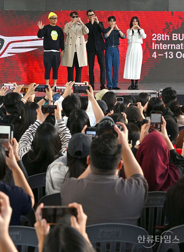 배우 조진웅, 차승원, 한효주, 오승훈, 백종열 감독이 5일 오후 부산 해운대 영화의 전당 야외무대에서 열린 ‘독전2’ 오픈토크에서 포토타임을 갖고 있다.