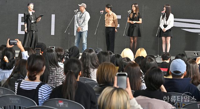 배우 유해진, 김희선, 한선화, 이한 감독이 6일 오후 부산 해운대구 영화의 전당 야외무대에서 열린 영화 '달짝지근해: 7510' 무대 인사에 참석하고 있다.