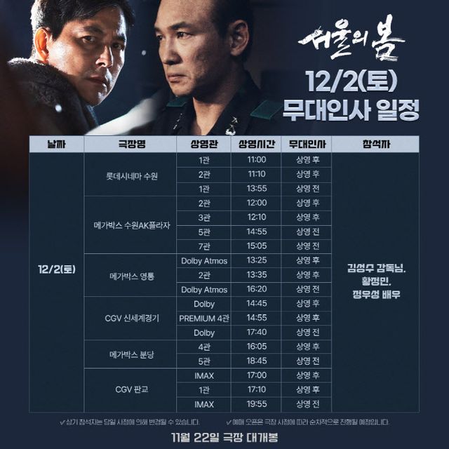 1979년 12월 12일 수도 서울에서 일어난 신군부 세력의 반란을 막기 위한 일촉즉발의 9시간을 그린 영화 ‘서울의 봄’이 언론시사 및 개봉 전 시사 이후, 뜨거운 호평 세례를 받으며 12월 2일(토)-3(일) 개봉 2주차 주말 무대인사를 확정했다.
