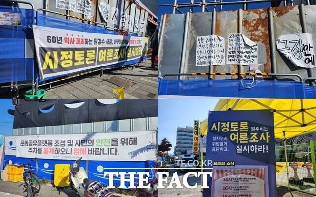 바로 옆에 위치한 민속풍물시장 상인들은 공사 가림막이 익숙해진 듯, 저마다 자리를 잡고 물건을 진열해 장사하고 있었고 시민들도 자연스럽게 통행하고 있었다. 길 건너편에는 '원주시는 시정토론 여론조사 실시하라'는 문구가 담긴 배너가 있었다.