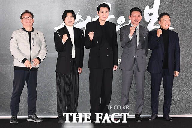 김성수 감독과 배우 김성균, 정우성, 황정민, 이성민(왼쪽부터)이 9일 오후 서울 강남구 메가박스 코엑스에서 열린 영화 '서울의 봄' 언론배급시사회에 참석해 포즈를 취하고 있다. /장윤석 기자