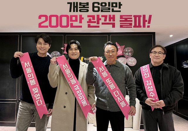 이날 플러스엠엔터테인먼트는 공식 소셜네트워크서비스 계정을 통해 ‘서울의 봄’ 출연진의 200만 돌파 인증샷도 함께 공개했다. 김성수 감독을 비롯해 배우 정우성, 김성균, 이성민이 풍선을 들고 관객들의 성원에 보답했다. 또다른 사진에서 감독과 배우진은 “서울의 봄 찢었다”, “서울의 봄 극장의 봄’, ‘서봄 또봄 다시봄”, “영화의신 김성수”라는 문구를 들고 200만 관객 돌파를 자축하고 있는 모습이다.