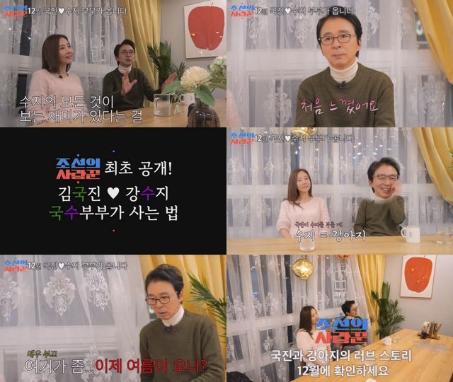 28일(오늘) ‘조선의 사랑꾼’ 시즌2 제작진이 공개한 영상에 첫 등장한 김국진♥강수지 부부는 명불허전 ‘사랑꾼’다운 깨소금 향을 풍겼다. 우선 강수지는 “김국진 씨 부인 강수지입니다”라고 자기소개를 했고, 김국진은 “사랑을 알 듯 말 듯, 기어코 알아낸...강수지 씨와 같은 집에 살고 있는 김국진입니다”라고 말했다. 서로를 ‘부부’로 좀처럼 소개하지 않았던 두 사람은 시종일관 쑥스러움을 감추지 못했다. 그러면서도 김국진은 “수지 씨랑 지내다 보면 걸어다니고 움직이는 것조차 보는 재미가 있다. 삐친 모습조차...살면서 처음 느낀다”며 아내에 대한 남다른 애정을 드러냈다.
