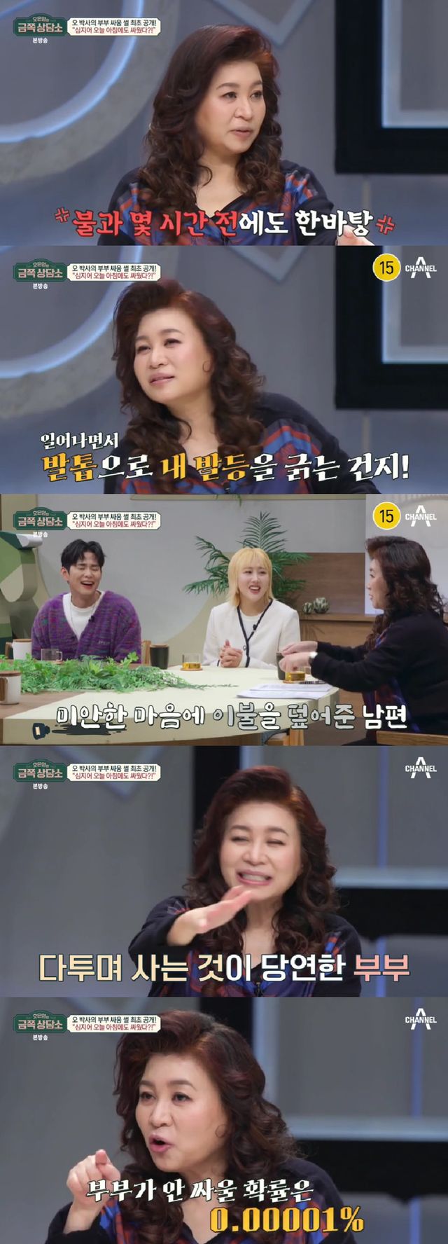 이에 오은영은 부부가 싸우지 않을 확률은 0.00001%에 가깝다며 "오늘 아침에도 남편과 싸웠다. 싸웠다기보단 티격태격을 했다"고 고백해 놀라움을 안겼다.