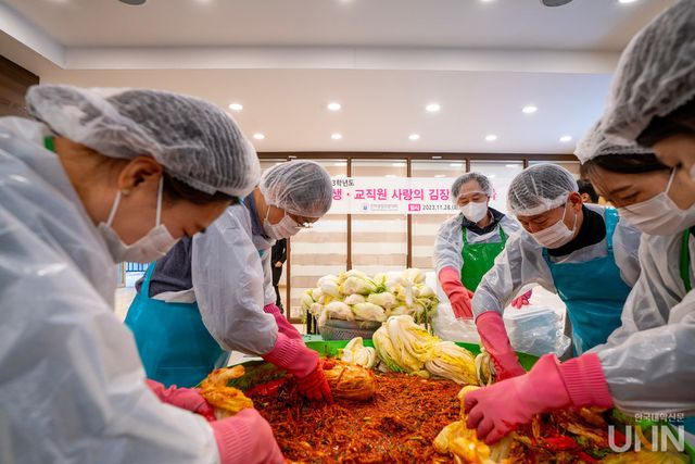 인하공전 3호관 교직원 식당에서 진행된 봉사활동에는 김성찬 총장을 비롯한 학생과 교직원 50여 명이 함께 총 250포기의 김장을 담갔다.