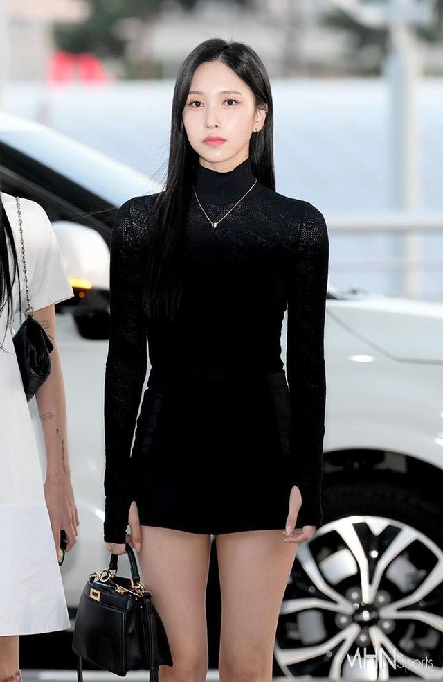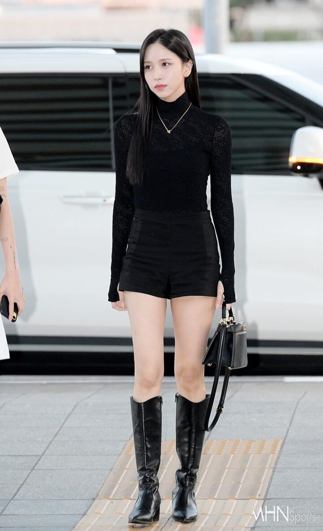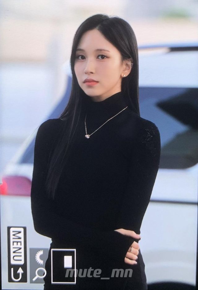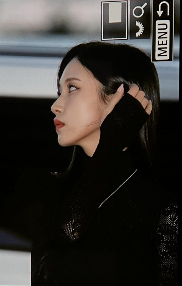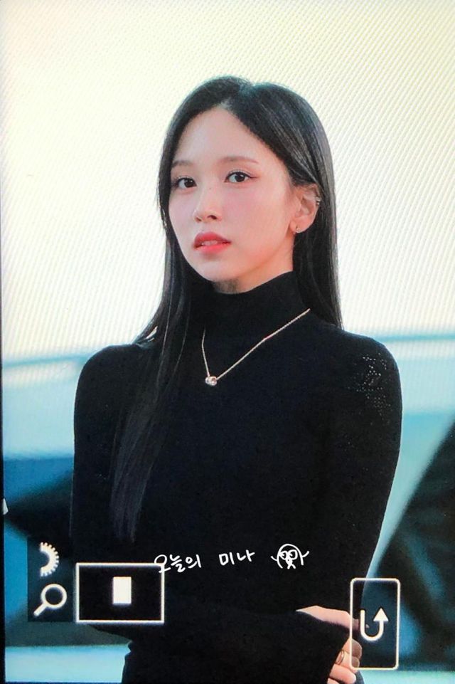 갈색 시스루 폴라티 + 오프숄더 패딩 분위기 쩌는 에스파 카리나