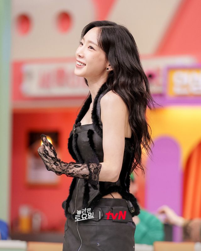 갈색 시스루 폴라티 + 오프숄더 패딩 분위기 쩌는 에스파 카리나