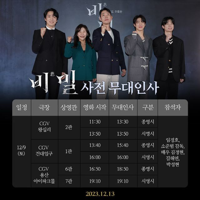 12월 13일(수) 개봉을 앞둔 ‘비밀’의 흥행을 향해 나아가는 무대인사를 확정 지은 가운데 임경호, 소준범 감독을 비롯 배우 김정현, 길해연, 박성현이 뜨거운 열정으로 영화 홍보에 나선다. 이들은 무대인사를 통해 적극적인 소통은 물론 팬서비스까지 관객들과 유쾌한 시간을 나눌 예정이다. 이번 무대인사는 CGV, 메가박스 홈페이지 및 앱을 통해 예매 가능하다.