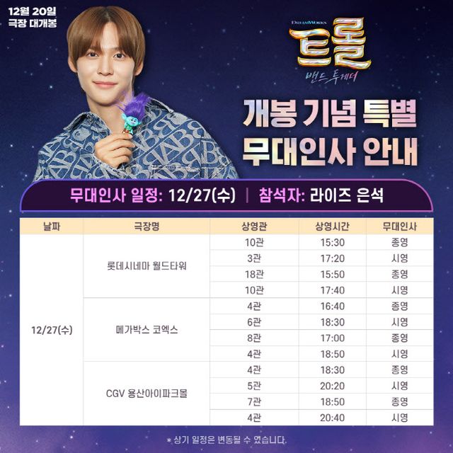 화려한 비주얼과 신나는 OST, 재미와 감동을 고루 갖춘 스토리텔링까지 관객들의 호평 세례를 받으며 12월 극장가를 신나게 팝 터뜨릴 것을 예고한 ‘트롤: 밴드 투게더’가 개봉 기념 특별 무대인사로 관객들과의 만남을 예고한다. 이번 ‘트롤: 밴드 투게더’ 개봉 기념 특별 무대인사에는 ‘브랜치’ 역을 연기한 라이즈 은석, ‘파피’ 역을 연기한 레드벨벳 웬디가 참석해 연말을 특별하게 기억할 수 있는 소중한 시간을 선물할 것이다. 먼저 12월 27일(수) 무대인사에는 ‘브랜치’ 라이즈 은석이 참석, 롯데시네마 월드타워를 시작으로 메가박스 코엑스, CGV용산아이파크몰을 방문해 ‘트롤: 밴드 투게더’를 관람하러 온 관객들과 만남을 예고한다. 이어 28일(목) 무대인사에는 ‘파피’ 역의 레드벨벳 웬디가 CGV왕십리, 롯데시네마 월드타워, 메가박스 코엑스를 찾은 관객들과 잊지 못할 특별한 시간을 보낼 것이다. ‘트롤: 밴드 투게더’ 개봉 기념 특별 무대인사는 오늘(15일) 오후 4시부터 순차적으로 예매 오픈될 예정으로, 무대인사에 대한 자세한 내용은 유니버설 픽쳐스 공식 SNS와 각 극장별 어플리케이션 및 홈페이지에서 확인할 수 있다.