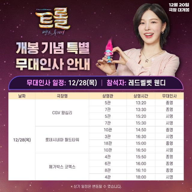 한편 K-트롤 라이즈 은석과 레드벨벳 웬디의 개봉 기념 특별 무대인사를 확정하여 예비 관객들의 기대감을 증폭시킨 ‘트롤: 밴드 투게더’는 12월 20일(수) 전국 극장에서 만날 수 있다.