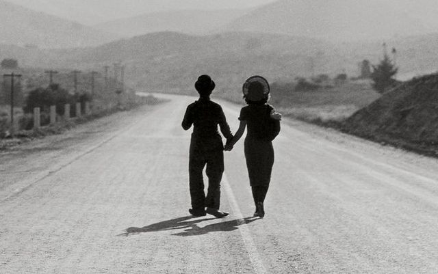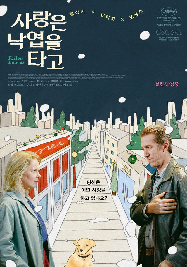 종이에 번호를 적어 건네고 극장 앞에서 다시 만난다는 것. 표면적으로는 디지털 중심주의에 대한 선명한 반동이면서 ― 이것이 끼니를 걱정하는 사람들의 영화임을 감안할 때 ― 우리가 갖지 못하기에 잃지 않을 수 있는 것들에 대한 쌉쌀한 직시처럼 보인다. 그들 사이에는 엇갈림이 있다. 문자 메시지조차 할 수 없는 시간의 기다림이 있다. 전화 할게요, 라든가 극장 앞에서 만나, 약속하고 그 시점까지는 반드시 기다려야만 하는 두 연인을 현실의 우리는 거의 상상하지 못한다. 은퇴를 번복하고서 6년만에 신작을 낸 아키 카우리스마키가 <사랑은 낙엽을 타고>에서 이 냉소적인 시대에 우리가 일용할 수 있는 유일한 양식은 곧 사랑이라는 것 다음으로 말하려는 바가 있다면 물리적인 연결의 세계로 돌아가자는 것이다. 일찌감치 감독의 이력을 보증한 1980년대 프롤레탈리아 3부작(<천국의 그림자>, <아리엘>, <성냥공장 소녀>)과 거의 비슷한 룩으로 찍혔고 여전히 80년대의 한 풍경이라고 해도 이상하지 않을 이 영화의 시제는 다시 말하지만 2024년이다. 상술한대로 그것은 피할 수 없이 악화될 미래일 수도 있지만, 달리 보면 연결이 있을 때 우리에게 미래가 생길 것이라는 희망의 전언도 된다.