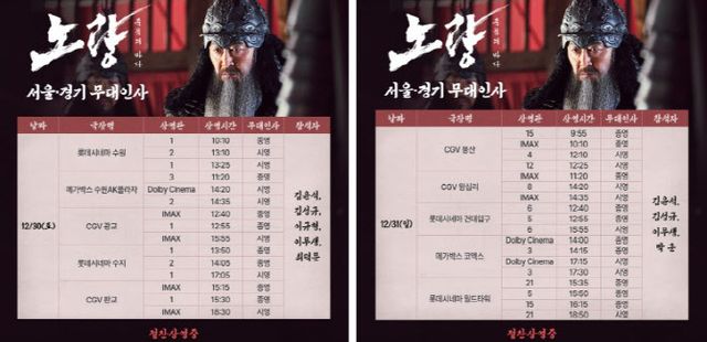 ‘노량: 죽음의 바다’ 팀은 12월 30일(토) 롯데시네마 수원을 시작으로 메가박스 수원AK플라자, CGV 광교, 롯데시네마 수지, CGV 판교를 방문한다. 12월 31일(일)에는 CGV 용산, CGV 왕십리, 롯데시네마 건대입구, 메가박스 코엑스, 롯데시네마 월드타워에서 관객들을 만난다.