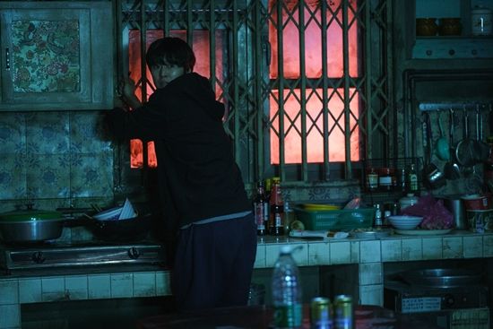 이번에 공개된 'SOS 제보' 스틸에는 평범한 시민 덕희에게 사기 친 조직원 재민이 보이스피싱 본거지에서 탈출을 시도하는 모습이 담겼다.