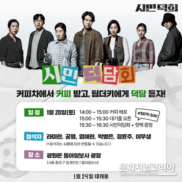오는 1월 20일 오후 3 시 30분 서울 광화문에 위치한 동아일보사 광장(서울 종로구 청계천로 1 동아일보사)에서 영화의 주역들과 함께하는 ‘시민 덕담회’ 커피차 이벤트를 개최하는 것.
