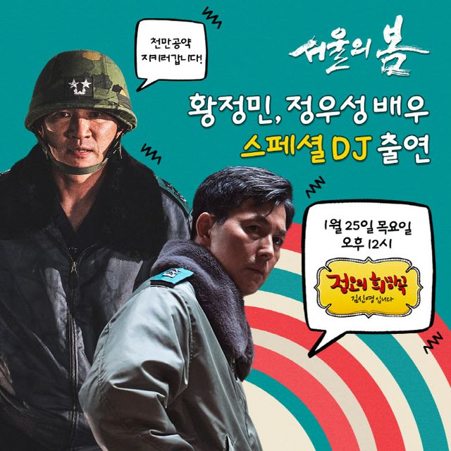 [이데일리 스타in 김보영 기자] 개봉 9주차에도 열렬한 성원 속에 흥행 열기를 이어가고 있는 영화 ‘서울의 봄’(감독 김성수)의 주역 황정민과 정우성이 천만 공약을 지킨다. 오는 25일(목) MBC FM4U ‘정오의 희망곡 김신영입니다’(이하 ‘정희’)에 스페셜 DJ로 등장한다.