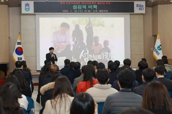 월요일 오전 업무 시간에 진행된 강연임에도 도 실국장과 직원, 출연 기관 관계자 등 100여명이 자리를 꽉 채웠고 김영환 지사도 맨 앞줄에 자리를 했다.