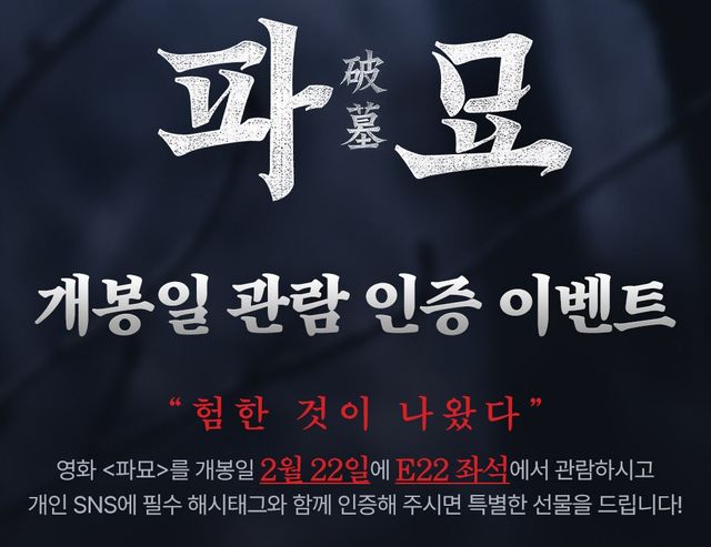 또한 '파묘'의 개봉일인 22일에 E22 좌석에서 관람할 경우, 개인 SNS에 인증샷을 올리면 방송인 홍진호의 사인 포스터를 추첨해 2명에게 증정한다고 밝혔다.