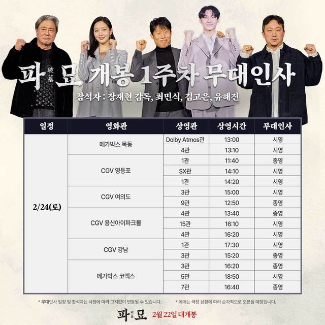 한편 '파묘' 1주 차 무대인사는 2월 24일(토)에는 '메가박스 목동', 'CGV 영등포', 'CGV 여의도', 'CGV 용산아이파크몰', 'CGV 강남', '메가박스 코엑스'에서 진행된다.