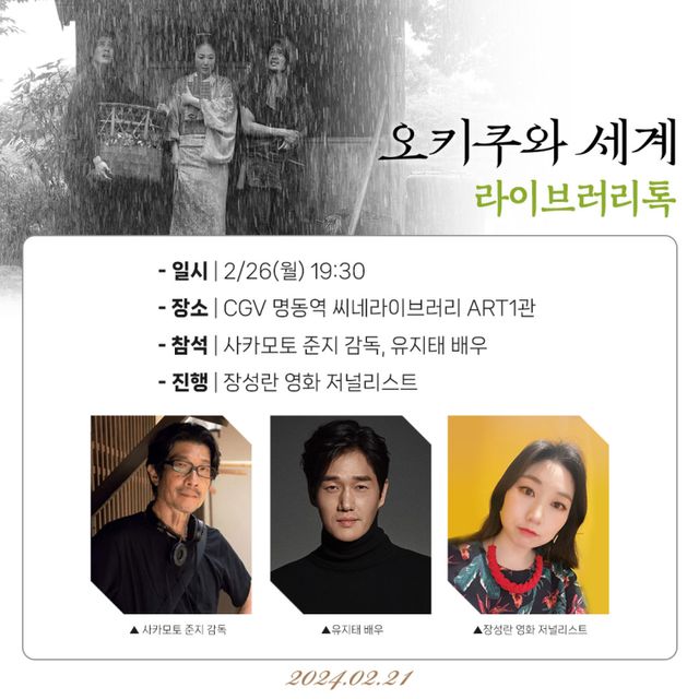 일본 뉴웨이브 대표 거장 사카모토 준지 감독은 30번째 작품이자 최초의 오리지널 각본으로 완성한 이제껏 본 적 없는 새로운 시대극이라는 평가를 받는다. 이 작품의 국내 개봉을 기념해 한국을 찾는 사카모토 준지 감독은 먼저 24일 오후 2시부터 30분간 에무시네마에서 미니 GV를 갖는다. 또 같은 날 오후 4시 아트나인에서 ‘좋은 날 프로젝트’로 ‘오키쿠와 세계’를 기획한 30년 차 베테랑 미술감독이자 프로듀서 하라다 미츠오와 함께 영화의 기획 단계부터 캐스팅, 촬영 및 제작 비하인드까지 낱낱이 파헤쳐보는 시간을 가진다.