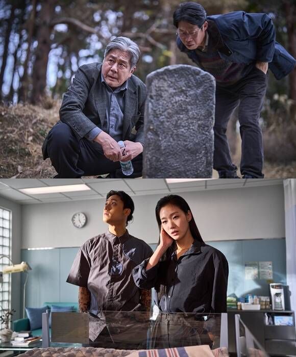 최민식(위쪽 사진의 왼쪽)은 풍수사 상덕 역을, 유해진은 장의사 영근 역을 맡아 데뷔 첫 오컬트 장르에 도전했다. /쇼박스