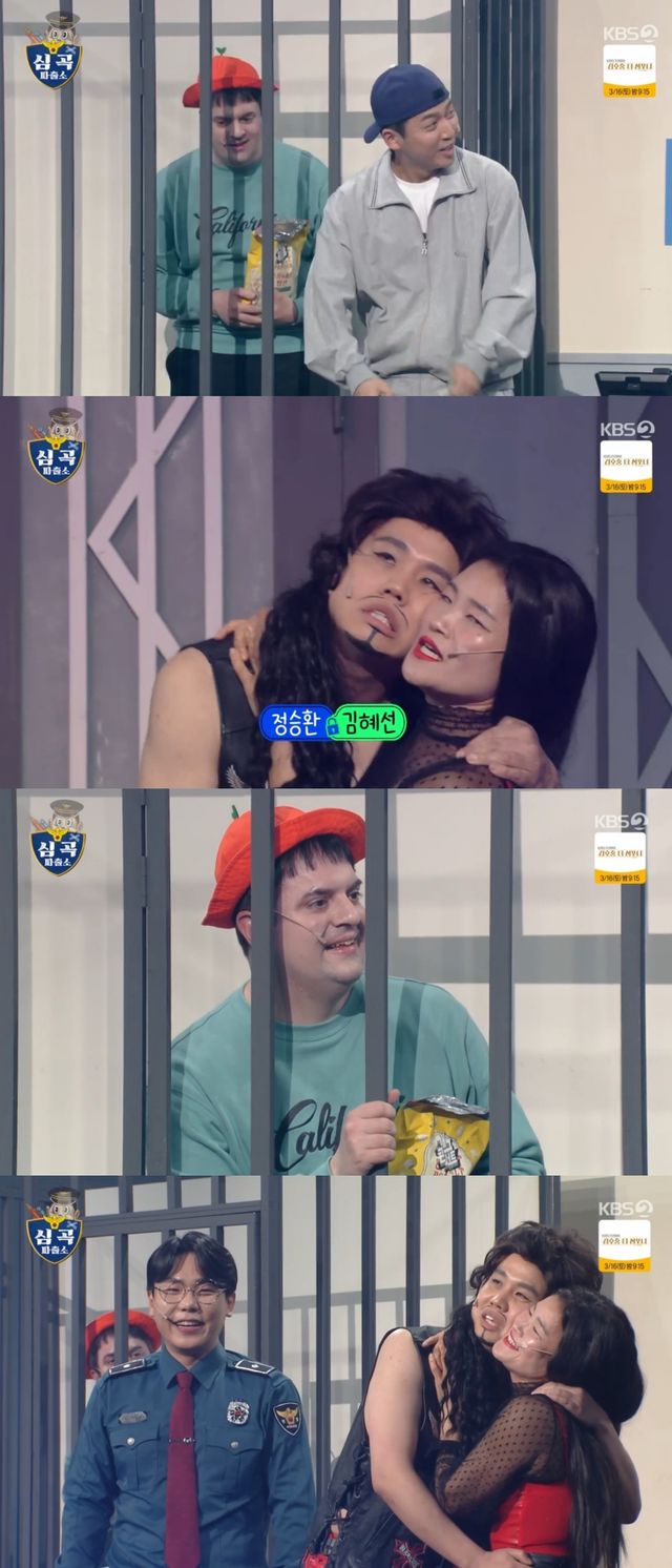 이날 송필근이 지키는 '심곡 파출소'에 출연한 김혜선의 남편 스테판은 경찰서를 숙박업소처럼 사용하는 등장으로 방청객들에게 웃음을 안겼다.