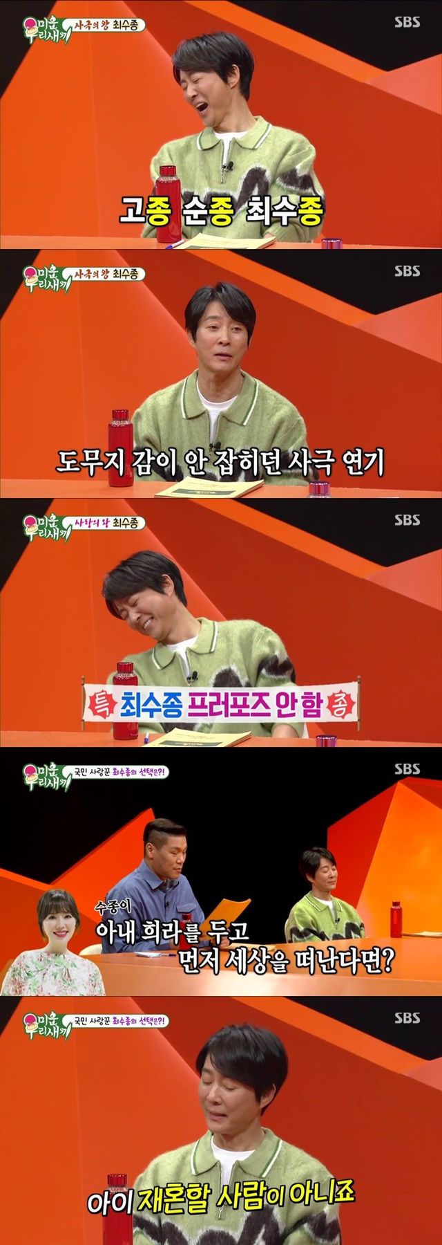 소문난 사랑꾼 최수종은 “만약 먼저 세상을 떠나게 된다면, 하희라 씨가 재혼을 했으면 좋겠냐”라는 MC 서장훈의 질문에 “재혼할 사람이 아니죠”라며 자신만만한 모습을 보였다. 그래도 만약 재혼했다면 어떨 것 같냐는 거듭된 질문에 최수종은 “아니 무슨 말을! 임현식 선생님도 20년 넘게 독거하셨는데”라며 버럭 하는 모습을 보였다.