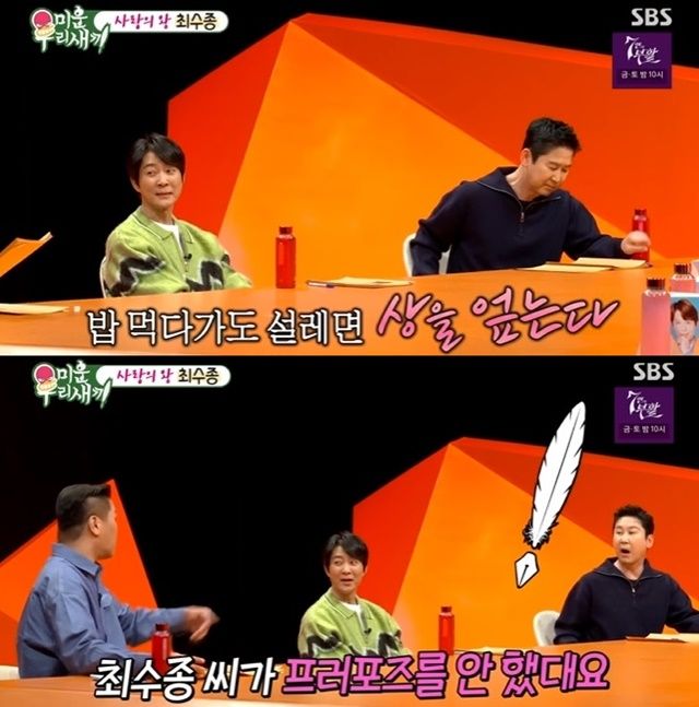서장훈은 "많은 남편들이 (최수종을 보고) 우울해할 수 있지만 희소식이 있다. 최수종이 프러포즈를 안 했다"고 강조했다. 또 "최수종은 프러포즈 안 했는데 난 했다. 남자들이 할 말이 생겼다"고 웃으며 말했다. 신동엽은 "뭐 하나 있겠지. 뭐 하나 걸렸다"고 좋아했다.