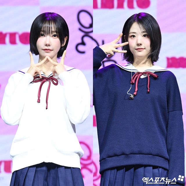 이날 쇼케이스에 참석한 QWER 마젠타, 히나가 포토타임을 갖고 있다.