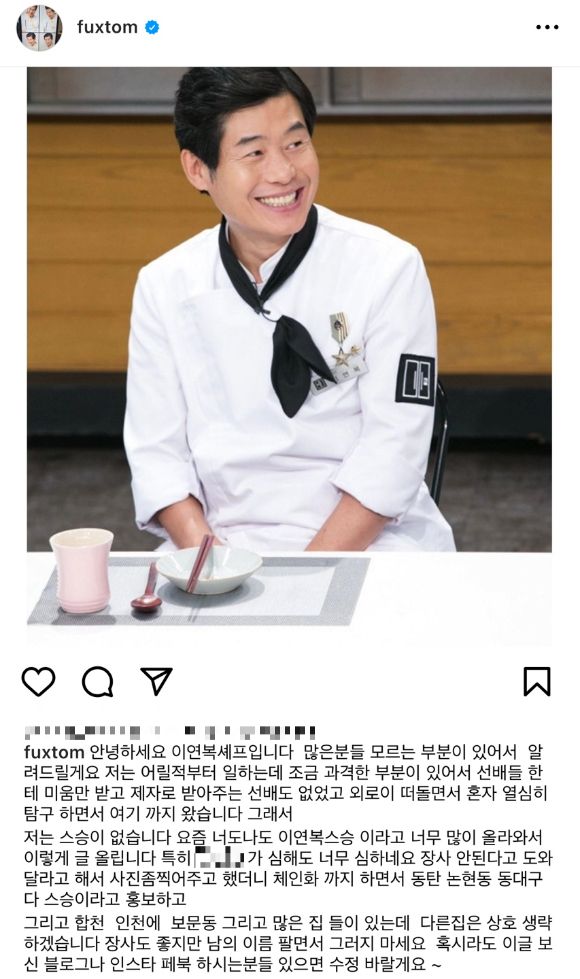 이 셰프는 1일 자신의 SNS에 "많은 분이 모르는 부분이 있어서 알려드린다"며 "나는 어릴 적부터 일하는데 조금 과격한 부분이 있어서 선배들한테 미움만 받고 제자로 받아주는 선배도 없었다. 혼자 열심히 탐구하면서 여기까지 왔다"고 게시글을 작성했다.