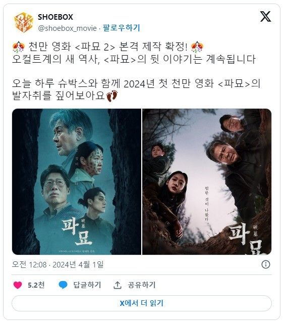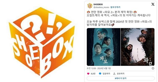 해당 게시물이 올라온 계정이 '파묘' 제작·배급사인 '쇼박스(SHOWBOX)' 공식 계정이 아닌 비공식(?) 계정 '슈박스(SHOEBOX)'였기 때문이다.