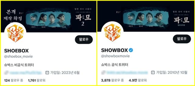 '파묘2' 제작 확정 소식을 전한 '슈박스' 계정(왼쪽). '파묘' 제작·배급사는 '쇼박스'로, 오른쪽이 X 공식 계정이다. / X(옛 트위터)