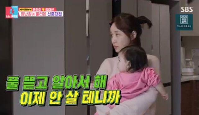 그러나 윤진이는 남편이 아이가 돌인데 3세용 장난감이라며 아이의 연령에 맞지 않는 장난감을 샀다고 지적했고 남편은 돌이지만 충분히 쓸 수 있다고 맞섰다. 반품을 해야 하니 뜯지 말라는 윤진이의 말에 남편은 아랑곳없이 택배를 뜯고 장난감 조립에 나섰다.