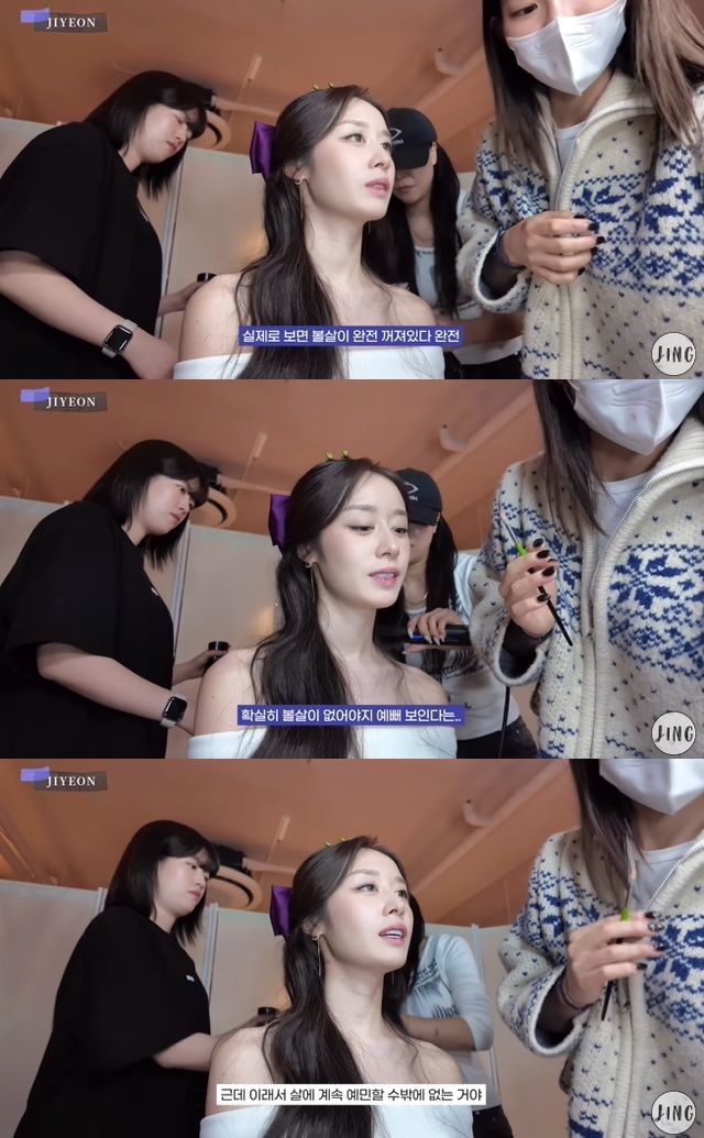 메이크업을 받던 지연은 "나 아침에 비해 얼굴이 많이 핼쑥해졌다"라고 운을 뗐다.