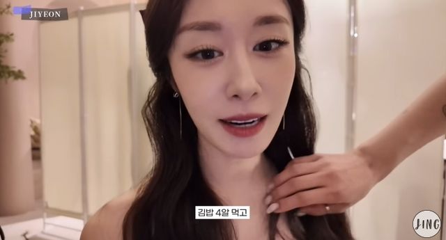 촬영을 마친 지연은 "오늘 촬영하면서 김밥 4알 먹었다. 배가 고프다"라고 털어놨다.