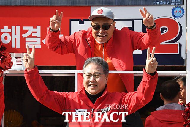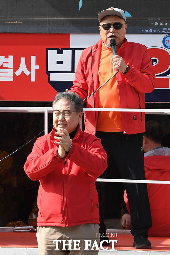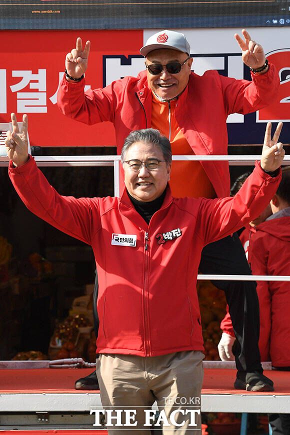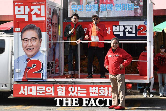 [더팩트ㅣ남용희 기자] 가수 김흥국(위)이 1일 오후 서울 서대문구 인왕시장 인근에서 박진 국민의힘 서대문을 후보의 지지를 호소하고 있다.