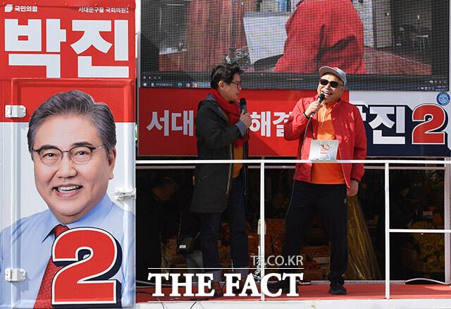 가수 김흥국(위)이 1일 오후 서울 서대문구 인왕시장 인근에서 박진 국민의힘 서대문을 후보의 지지를 호소하고 있다. /남용희 기자