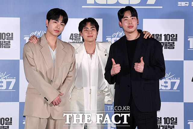 배우 구준회와 조병규, 최희승(왼쪽부터)가 1일 오후 서울 용산구 CGV 용산 아이파크몰에서 열린 영화 '어게인 1997' 시사회 및 기자간담회에 참석해 포즈를 취하고 있다. /서예원 기자