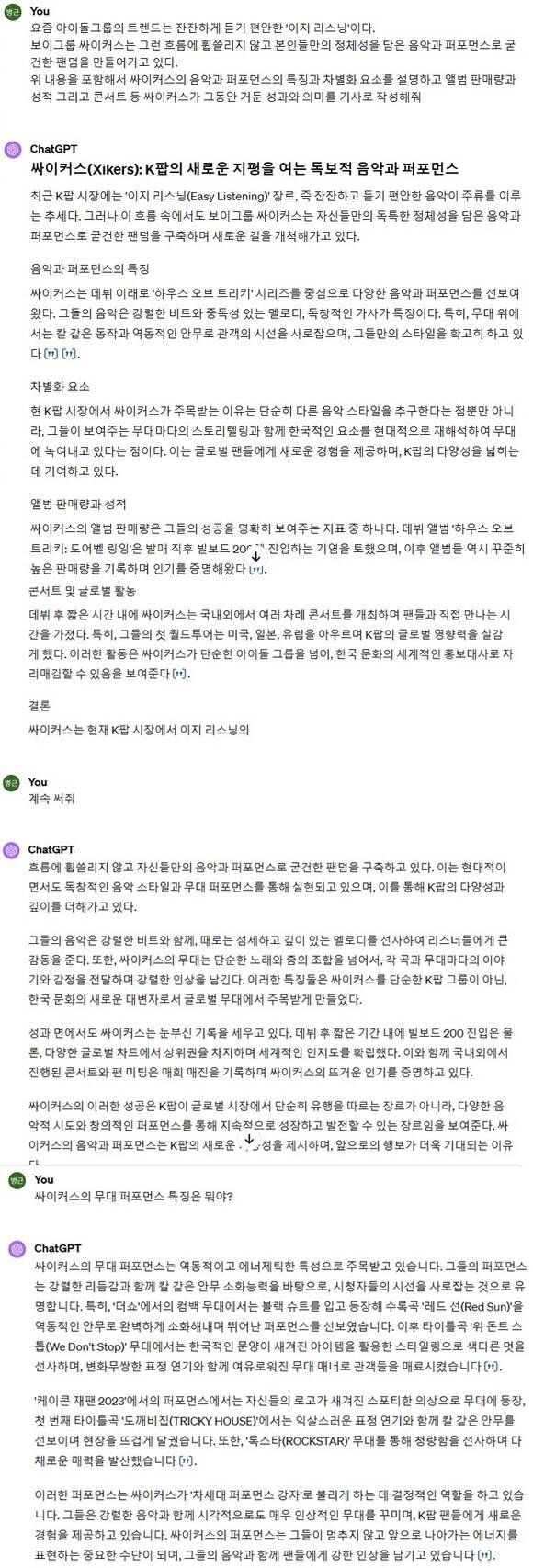 챗GPT는 기사 내용에서 "싸이커스는 K팝이 글로벌 시장에서 단순히 유행을 따르는 장르가 아니라, 다양한 음악적 시도와 창의적인 퍼포먼스를 통해 지속적으로 성장하고 발전할 수 있는 장르임을 보여준다. 싸이커스의 음악과 퍼포먼스는 K팝의 새로운 가능성을 제시하며, 앞으로의 행보가 더욱 기대된다"고 평했다. /챗GPT 캡처