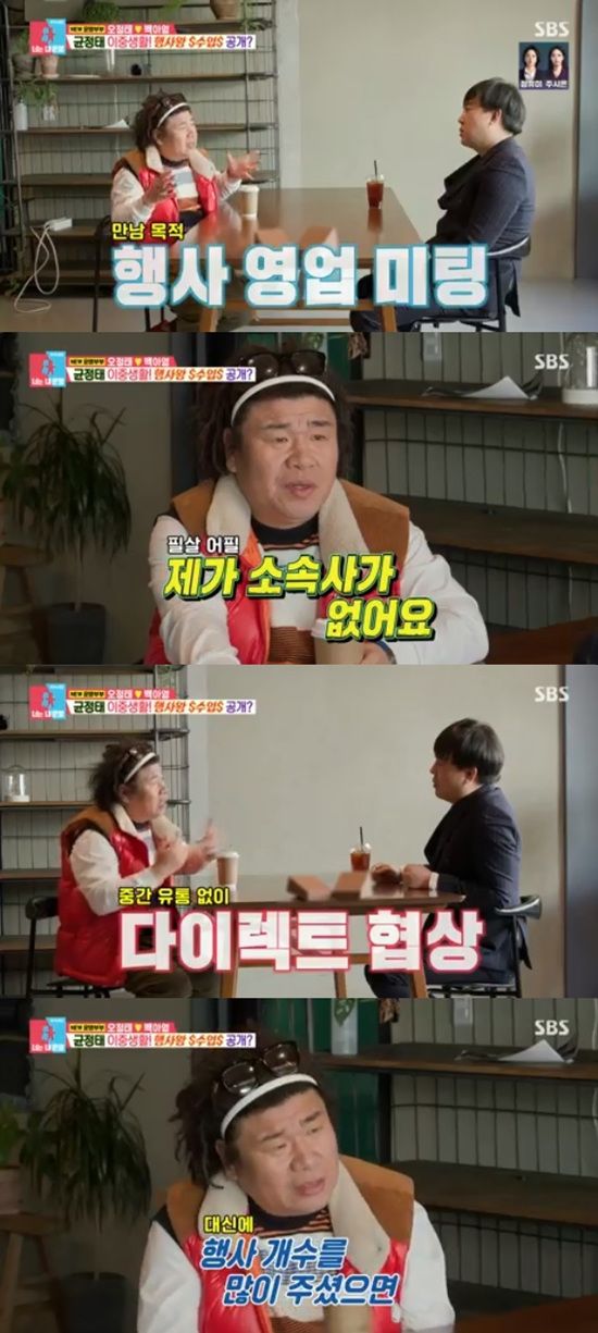 대표는 오정태에게 행사를 40개 정도 할 수 있다고 얘기해줬다. 오정태는 자신이 소속사 없이 활동하는 것을 강조하며 "단가를 맞춰줄 수 있다. 대신 개수를 많이 주셨으면 한다"고 말했다.