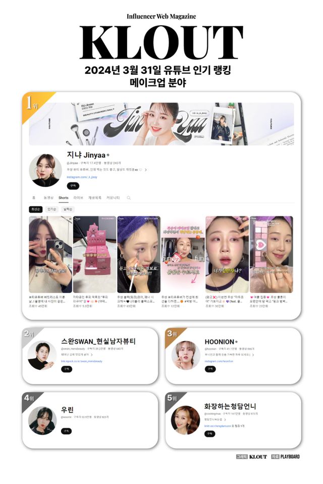 한편 2위는 맨즈 뷰티 크리에이터 '스완SWAN_현실남자뷰티', 3위 팩폭 리뷰어 'HOONION', 4위 구독자 32.5만 명의 '우린', 5위는 글로벌 MCN기업 트레져헌터 소속 크리에이터 '화장하는 청담언니'가 랭크됐다.