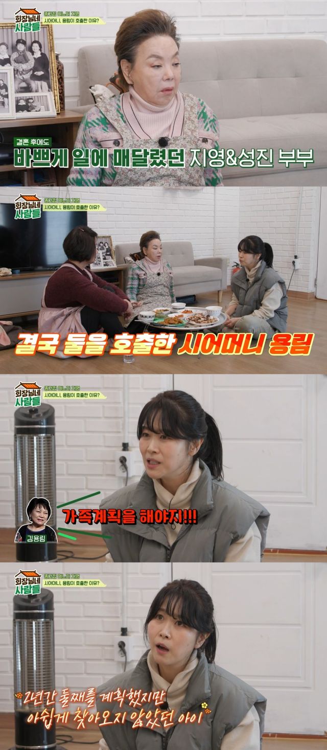 그는 본인과 남성진 둘 다 일을 멈추지 않고 바쁘게 하고 있었는데, 어느 날 시어머니인 김용림이 두 사람을 호출했다고 말을 이었다.