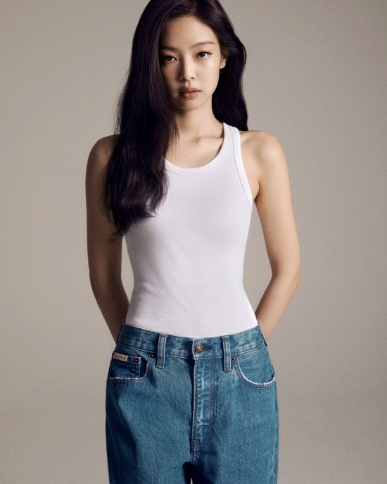 그녀만의 독보적 자신감을 보여준다. 제니는 하이웨이스트 릴렉스핏의 90s 루즈핏 데님을 코튼 컨투어 립 탱크 탑과 매칭하여 편안하면서도 스타일리시한 룩을 연출한다.