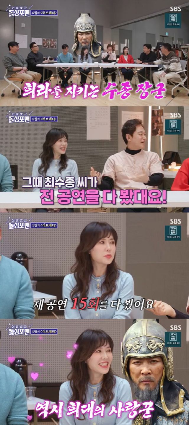 이날 정보석은 “최수종 씨가 하희라 씨의 전 회 공연 15회를 다 봤다”며 “더 무서운 경험을 했다. 연습 끝나고 걸어가는데 최수종 씨가 지금 엄청 바쁘지 않나. 그 와중에 하희라 씨를 데리러 온 거다”고 최수종의 놀라운 면모를 전했다.